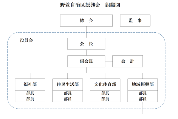 この会は、『野萱に住んで良かった』と実感できる地域にするため、地区住民相互の連帯と親睦を図り、社会基盤の整備促進、文化、経済、健康福祉および生活の向上、並びに地区の発展に努め、明るく住みよい地域社会を目指す。